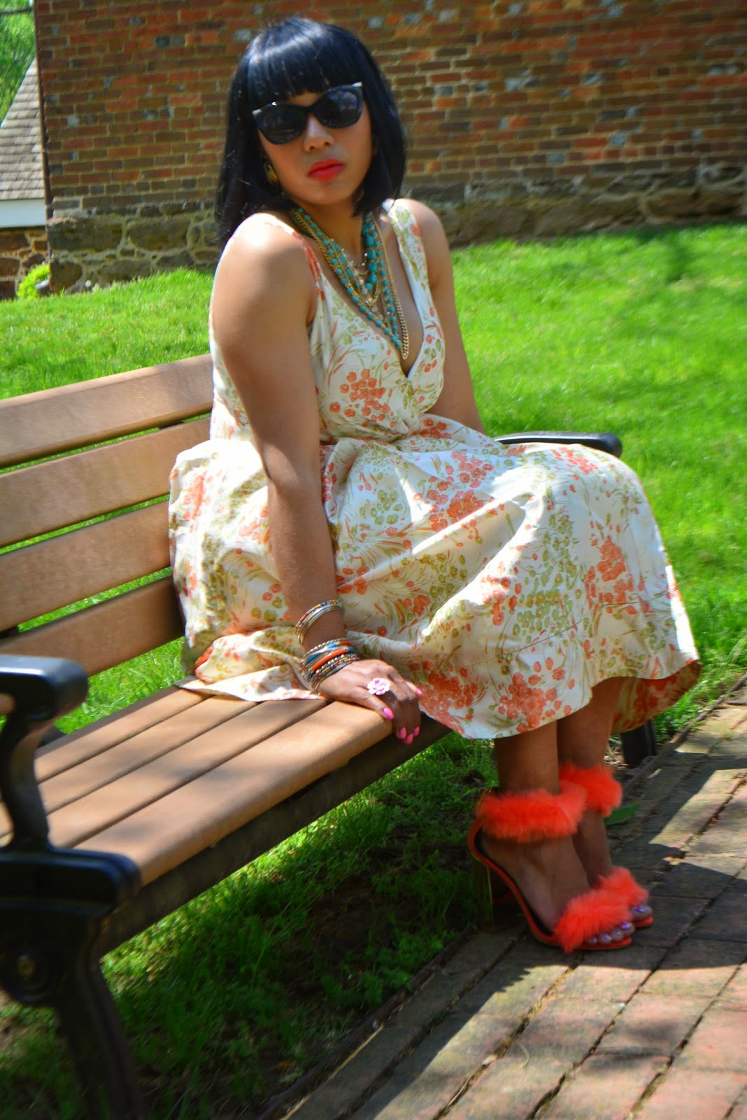 Add visual interest to a standard Sunday floral dress with fluffy heels.